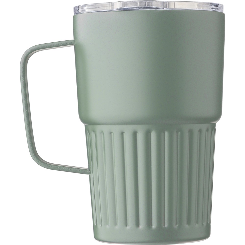 Újrahasznosított rozsdamentes acélból készült, duplafalú ivópohár (450 ml), belső része 304-es, külső része 201-es rozsdamentes acél, bordázott fogófelülettel és masszív fogantyúval. AS fedéllel rendelkezik csúsztatható zárással. A pohártesten gravírozott recycled (újrahasznosított) alapanyagra utaló logó található. Darabonként barna kartondobozba csomagolva. Emblémázás: Bögredekor, Gravírozás