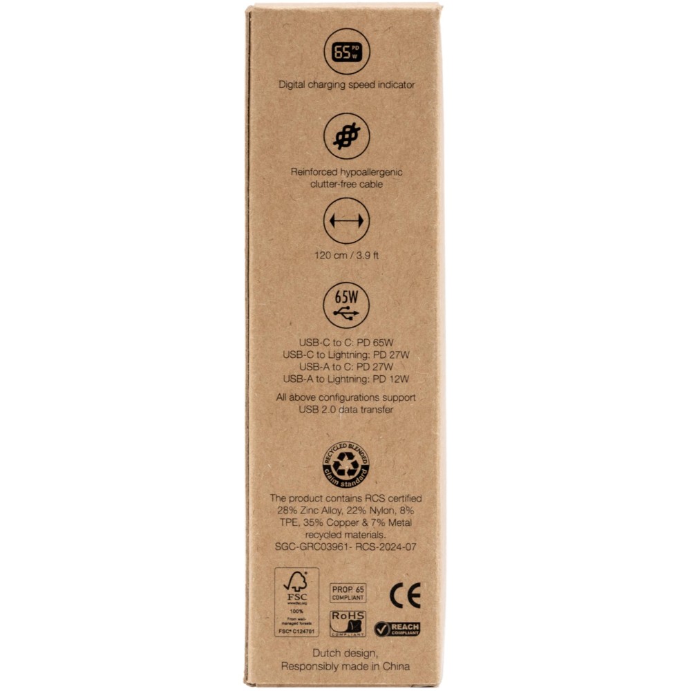A BrandCharger Thor Eco 4 az 1-ben töltőkábel akár 65 W gyorstöltést is támogat, USB 2.0 adatátvitellel. 120 cm hosszúságú kábel újrahasznosított nejlonból, Type-C és USB-A bemenettel, valamint Type-C és Lightning kimenettel. Emblémázás: Gravírozás