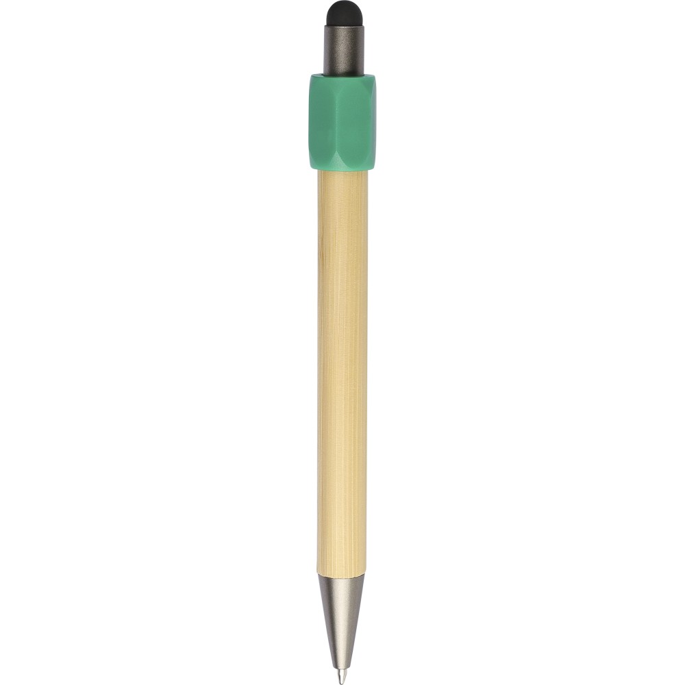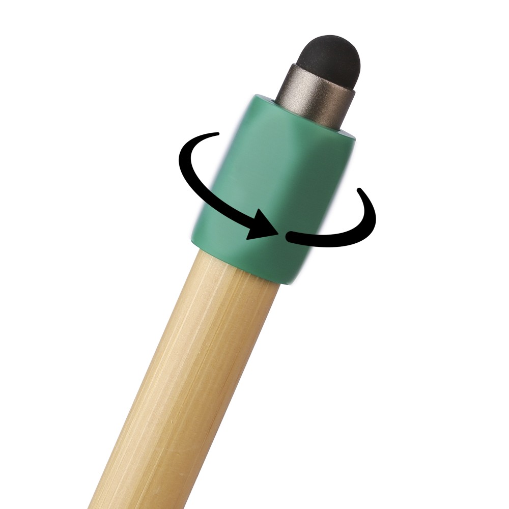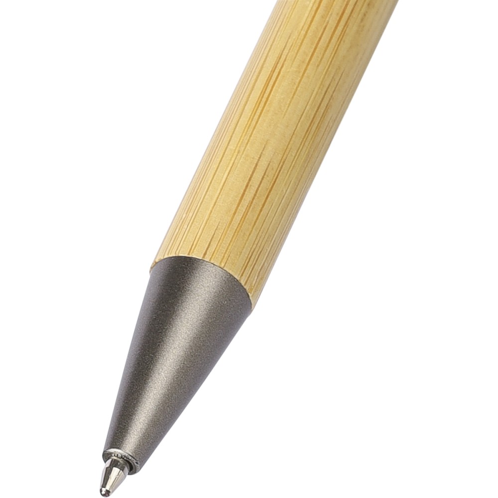 Bambusz golyóstoll újrahasznosított ABS pörgettyűvel és fekete érintővel a nyombógombon. A tollhegy vastagsága 1.0 mm, íráshossz: kb. 800 méter. Az újrahasznosított anyagra utaló logó a tollra van gravírozva. Emblémázás: Gravírozás, Tamponnyomás