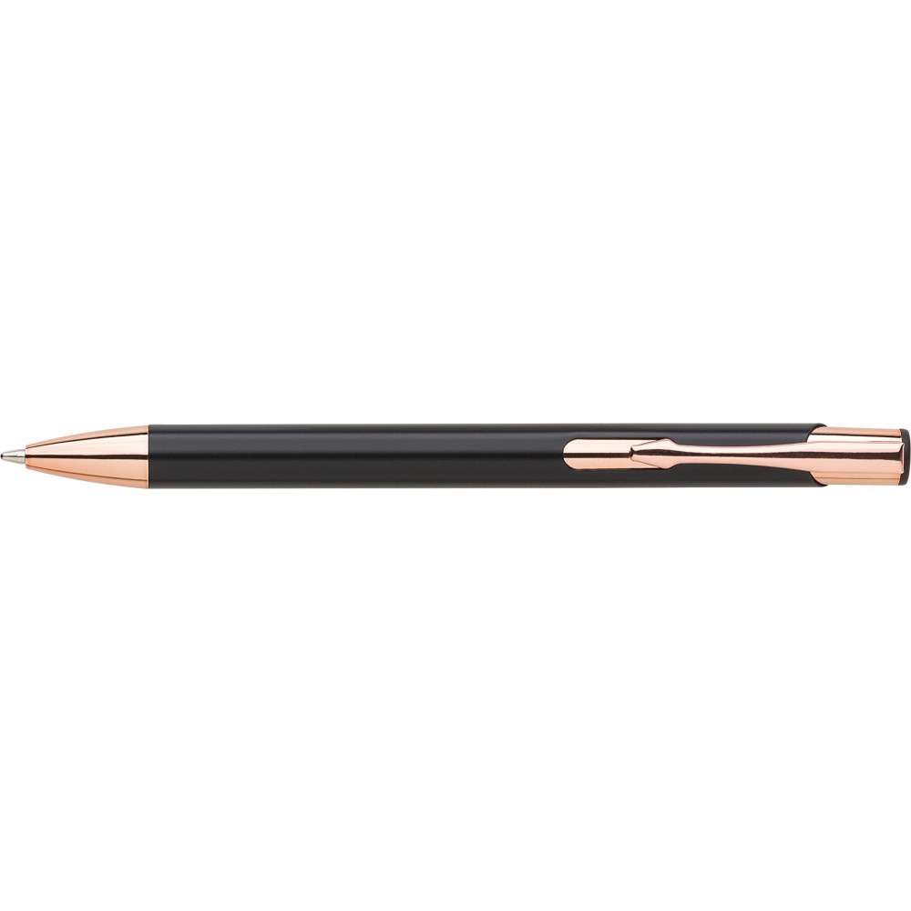 Alumínium golyóstoll matt felülettel, rózsaarany részletekkel, kék tollbetéttel. Emblémázás: Gravírozás, Tamponnyomás, UV nyomtatás