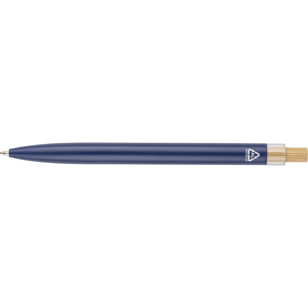 Újrahasznosított alumíniumból készült, lakkozott, nyomógombos golyóstoll bambusz nyomógombbal, rPET díszítéssel és fém klippel. A tolltesten gravírozott recycled (újrahasznosított) alapanyagra utaló logó található. Megközelítőleg 700 méter íráshossz, kék tollbetéttel.