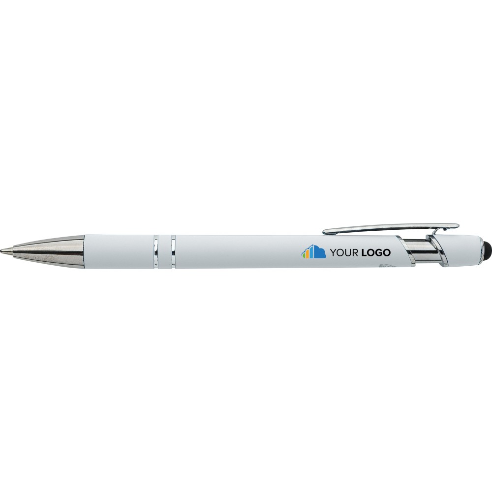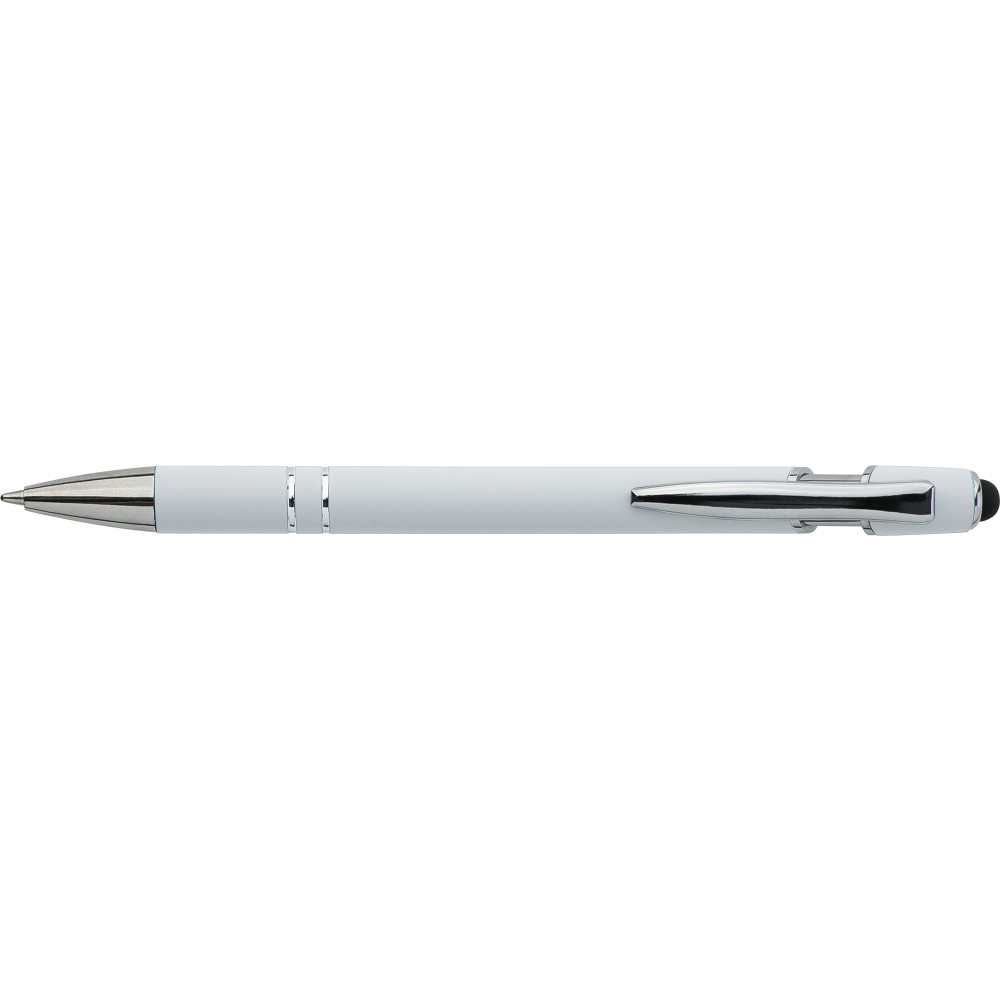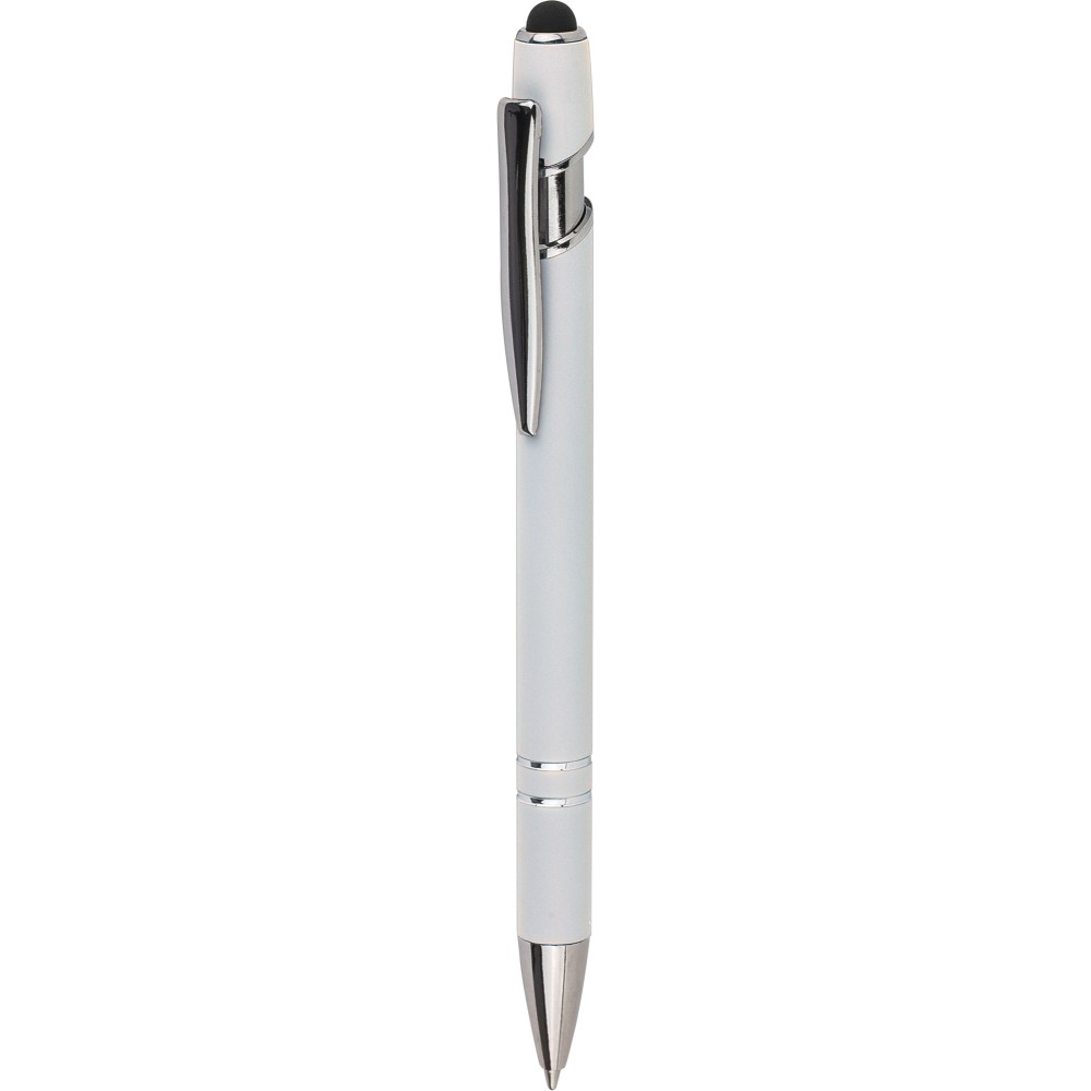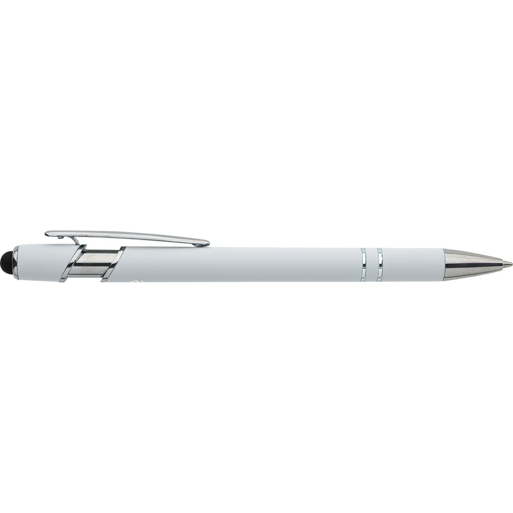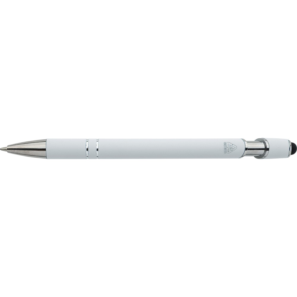 Újrahasznosított alumínium golyóstoll egyszínű, gumírozott felületű testtel és fekete, kapacitív érintőképernyőkhöz használható stylus véggel. Ezüstszínű kiegészítőkkel, nyomógombos szerkezettel és fekete tollbetéttel tervezve. A tolltesten gravírozott újrahasznosított logó található.