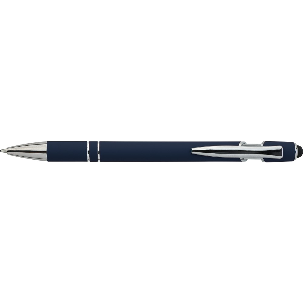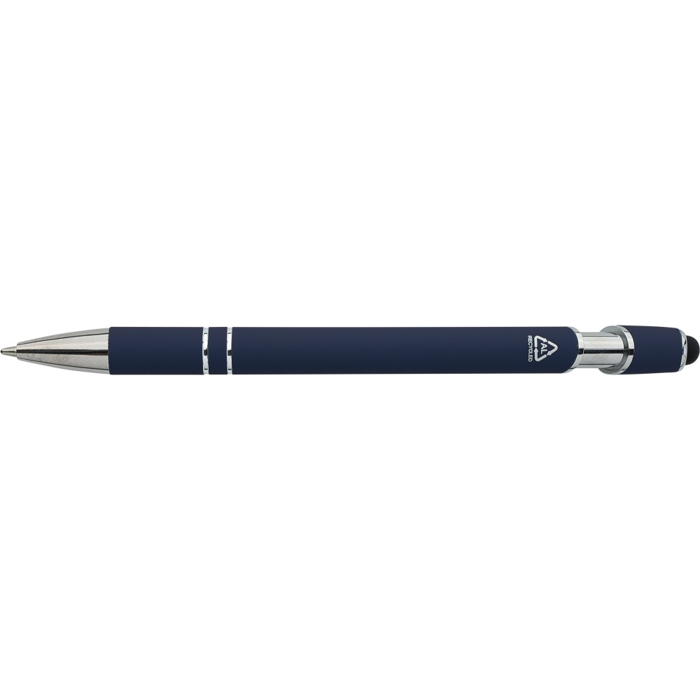 Újrahasznosított alumínium golyóstoll egyszínű, gumírozott felületű testtel és fekete, kapacitív érintőképernyőkhöz használható stylus véggel. Ezüstszínű kiegészítőkkel, nyomógombos szerkezettel és fekete tollbetéttel tervezve. A tolltesten gravírozott újrahasznosított logó található.
