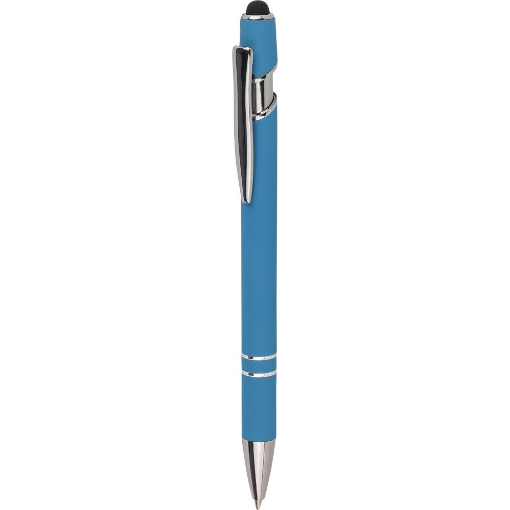 Újrahasznosított alumínium golyóstoll egyszínű, gumírozott felületű testtel és fekete, kapacitív érintőképernyőkhöz használható stylus véggel. Ezüstszínű kiegészítőkkel, nyomógombos szerkezettel és fekete tollbetéttel tervezve. A tolltesten gravírozott újrahasznosított logó található.