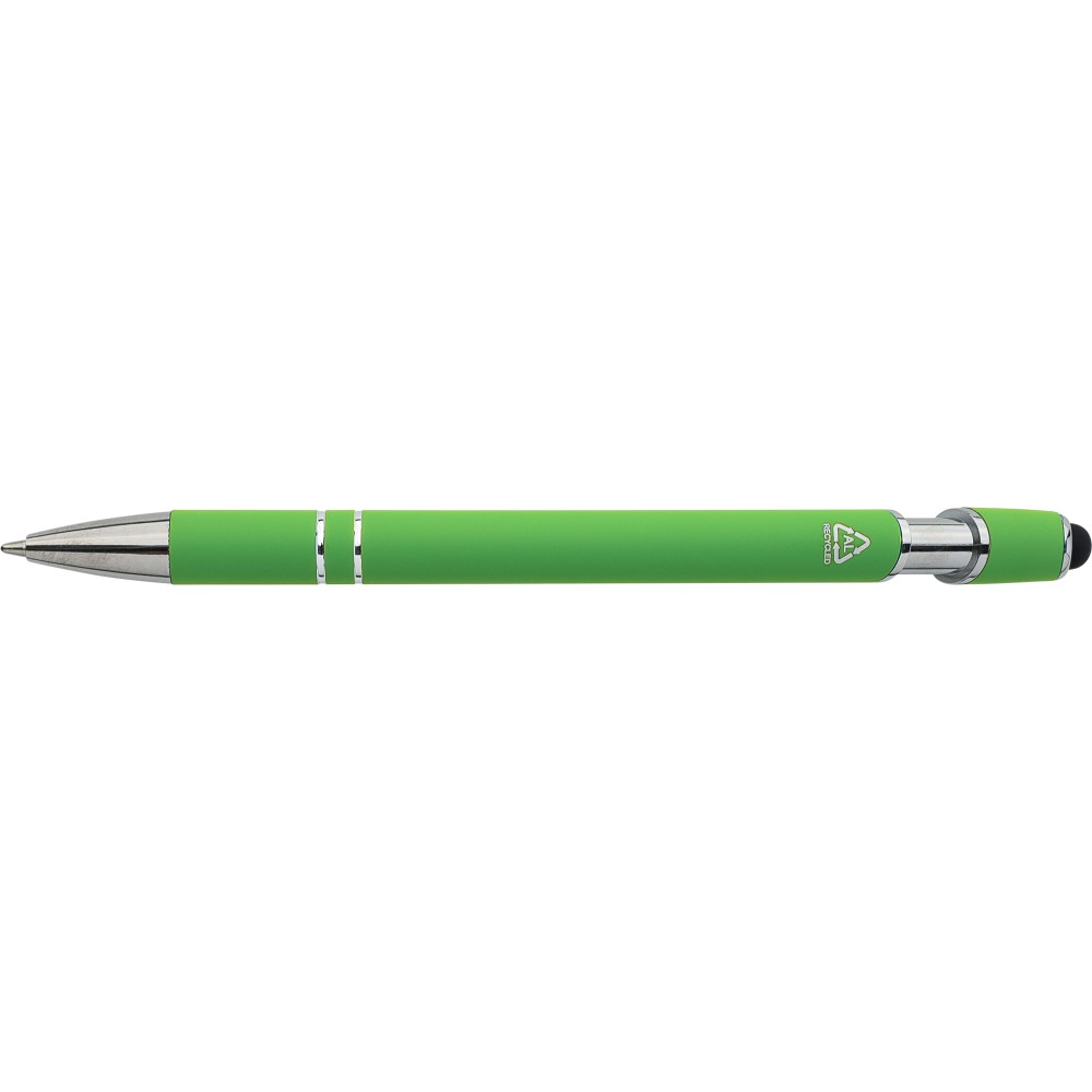 Újrahasznosított alumínium golyóstoll egyszínű, gumírozott felületű testtel és fekete, kapacitív érintőképernyőkhöz használható stylus véggel. Ezüstszínű kiegészítőkkel, nyomógombos szerkezettel és fekete tollbetéttel tervezve. A tolltesten gravírozott újrahasznosított logó található.
