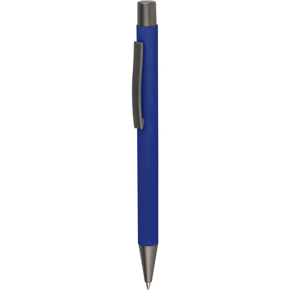 Újrahasznosított alumínium golyóstoll lágy tapintású gumírozott felülettel és kék tollbetéttel. Sötétszürke kiegészítőkkel és a bevonat alatti tükörhatású réteggel tervezve a látványos gravírozási eredmény érdekében. Nyomógombos szerkezettel és gravírozott újrahasznosított logóval.