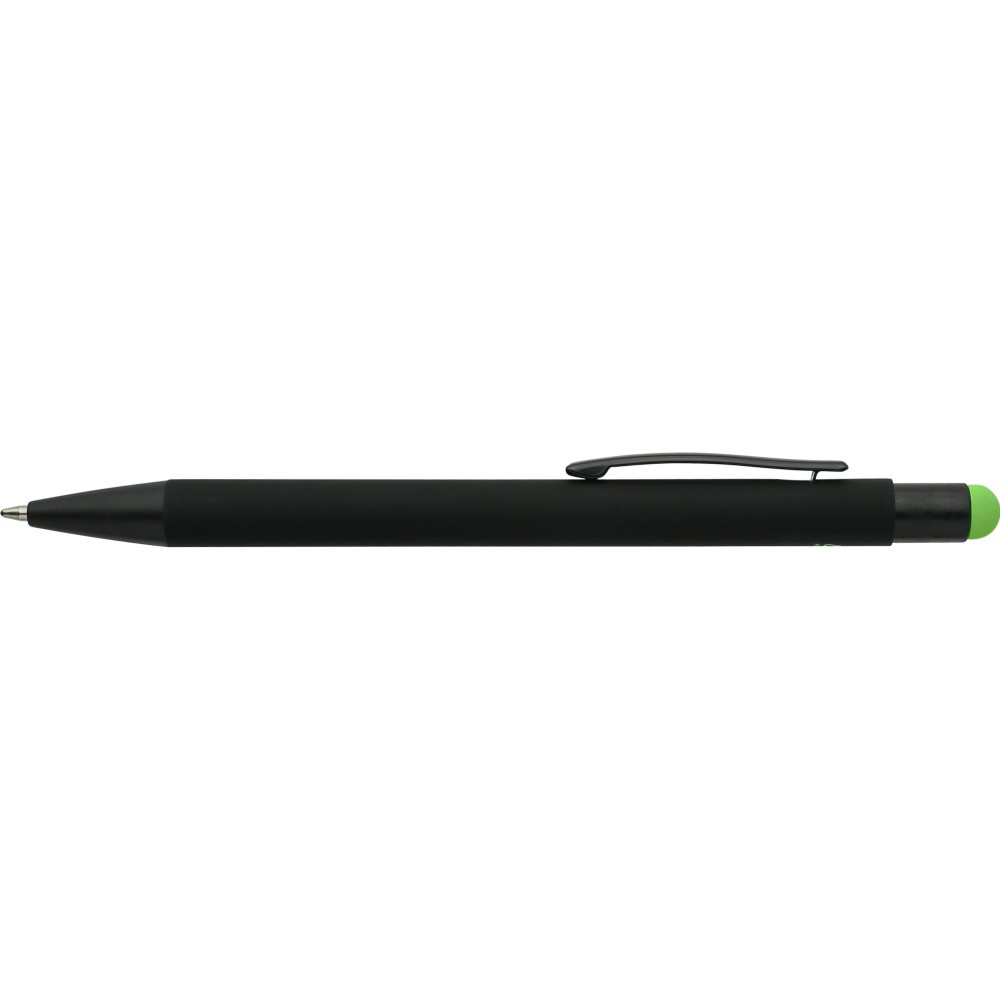 Újrahasznosított alumínium golyóstoll fekete, gumírozott felülettel és kék tollbetéttel. Színben illeszkedő kiegészítőkkel ? beleértve a belső tolltestet és az érintőképernyőkhöz használható stylus véget ?, amelyek kifinomult kontrasztot alkotnak gravírozáskor. Nyomógombos szerkezettel és gravírozott újrahasznosított logóval.