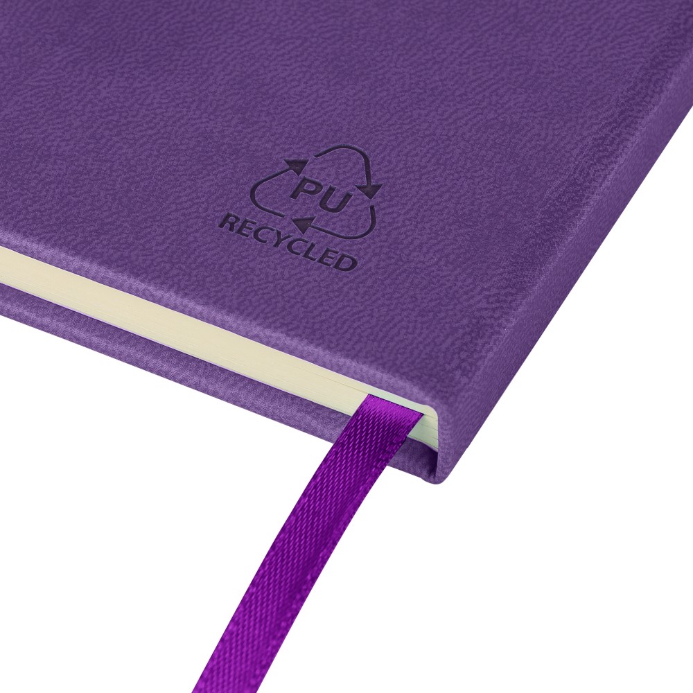 A5-ös jegyzetfüzet újrahasznosított kemény PU borítóval, a hátoldalán dombornyomott újrahasznosított logóval. Tartós és rugalmas anyagból készült, amely kényelmes fogást, párnázottságot és hosszan tartó használatot biztosít. A borító lézergravírozásra alkalmas, amely során finom, tone-on-tone (színazonos) hatás érhető el. 80 vonalas, 70 g/m2 súlyú lapot tartalmaz, színben illeszkedő gumírozott rögzítőpánttal, könyvjelző szalaggal és tolltartó hurokkal. A füzetben használt papír FSC Mix tanúsítvánnyal rendelkezik.