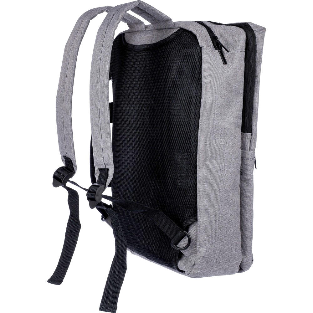 Hátizsák és laptoptáska 15 -es készülékhez. Kézipoggyász méretű. Hordozófüllel a tetején, állítható vállpántokkal és két oldalsó fogantyúval. Az állítható pántok a párnázás mögé rejthetők, így az oldalsó fogantyúkkal is hordozható. Tépőzáras laptoprekesszel és kis cipzáras zsebbel rendelkezik. Szellőző, párnázott hátoldallal. Terhelhetősége kb. 8 kg. RPET alapanyagra utaló címkével. Anyaga: 300D RPET poliészter. Emblémázás: Hímzés, Szitanyomás