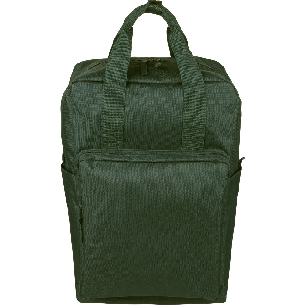 Újrahasznosított 900D poliészterből készült hátizsák, 210D béléssel és rPET címkével. Tágas fő rekesszel rendelkezik, 16?-os laptop számára kialakított külön zsebbel, elülső rekesszel, két oldalzsebbel, valamint bőröndre rögzíthető pánttal (trolley strap). Felső fogantyúi gombbal összefoghatóak, vállpántjai szellőző kialakításúak a kényelmes viselet érdekében.