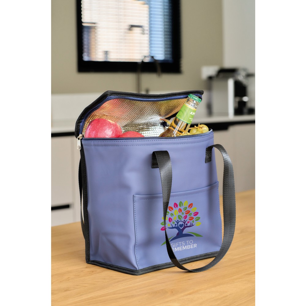 Újrahasznosított PU anyagból készült hűtőtáska 9 literes űrtartalommal, 210D újrahasznosított poliészter béléssel. 2,5 × 66 cm méretű hosszú fülekkel és elülső tárolózsebbel rendelkezik. A belső címkén újrahasznosított alapanyagra utaló logó található.