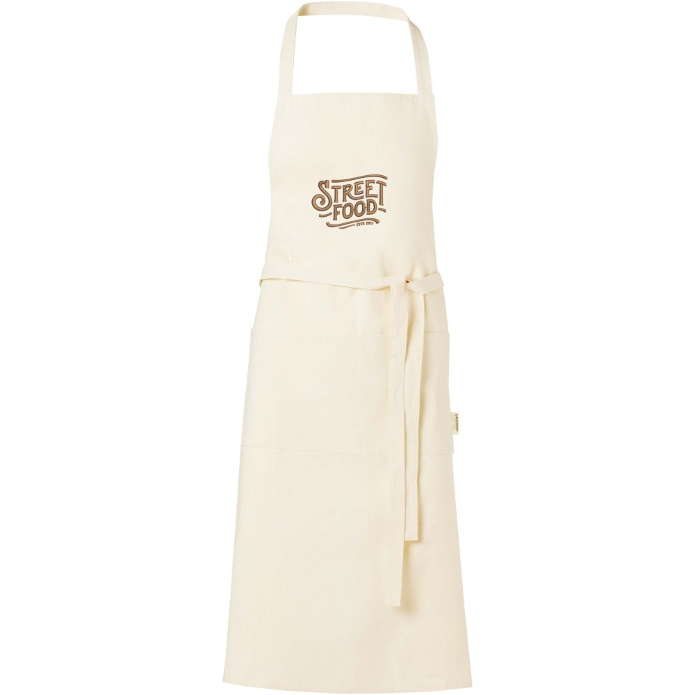 100% OCS tanúsítvánnyal rendelkező, 200 g/m2 sűrűségű, indiai származású organikus pamutból készült kötény, amely két darab, összesen 45 x 20 cm méretű zsebbel és 1 méteres megkötővel rendelkezik. A pánt hossza 55 cm.