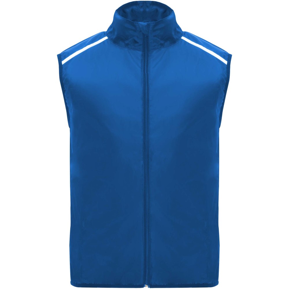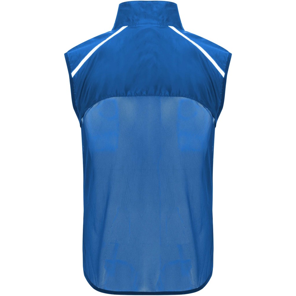 Szélálló és légáteresztő. Elülső cipzár azonos színű állvédővel. Rugalmas szegély a karkivágásnál és az alján. A hát alsó része mikroperforált anyagból készült. Fényvisszaverő csíkok a vállán. Zseb rugalmas pánttal, amelybe a mellényt el lehet csomagolni. Eltávolítható címke. Emblémázás: Szitanyomás