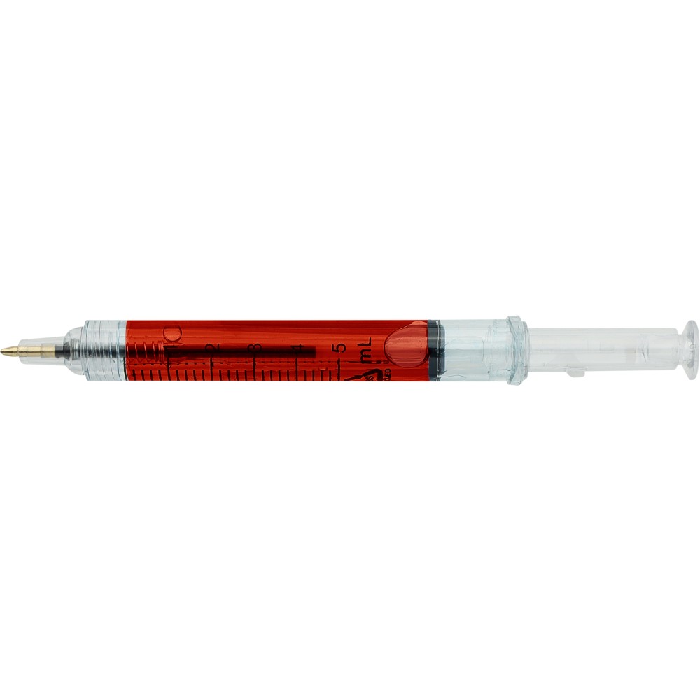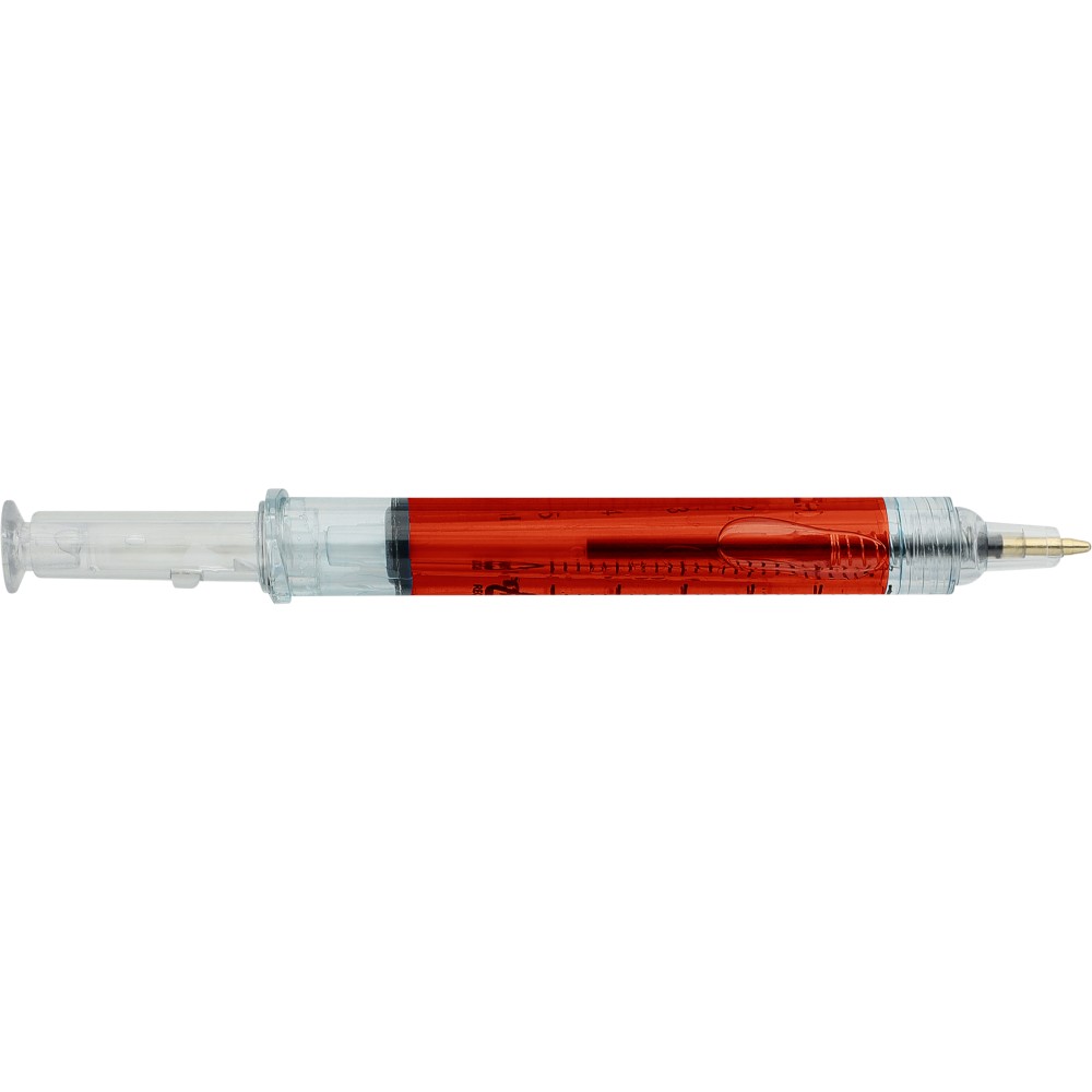 Színes folyadékkal töltött fecskendő alakú golyóstoll. Újrahasznosított ABS-ből készült, nyomógombos szerkezetű, fekete tollbetéttel szállítjuk. Érintőképernyőkhöz használható stylus véggel rendelkezik. In-mould (öntőformában elhelyezett) újrahasznosított ABS logóval díszítve.