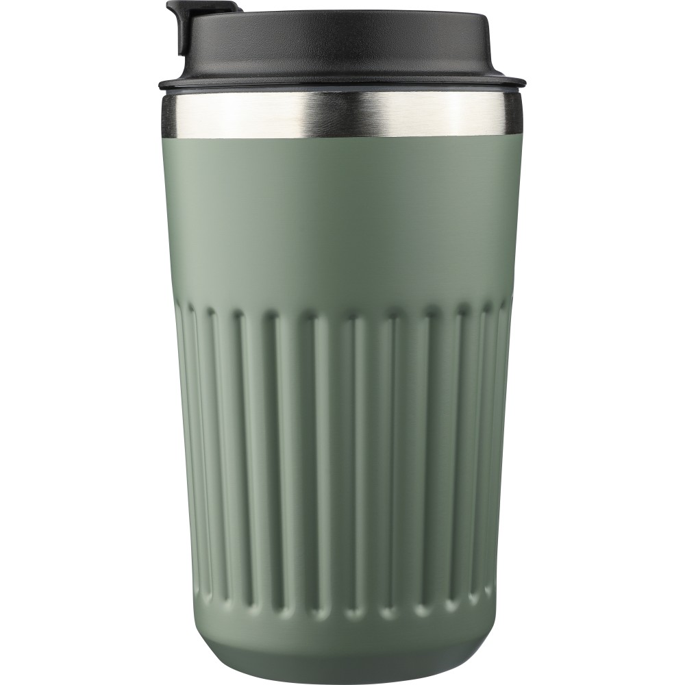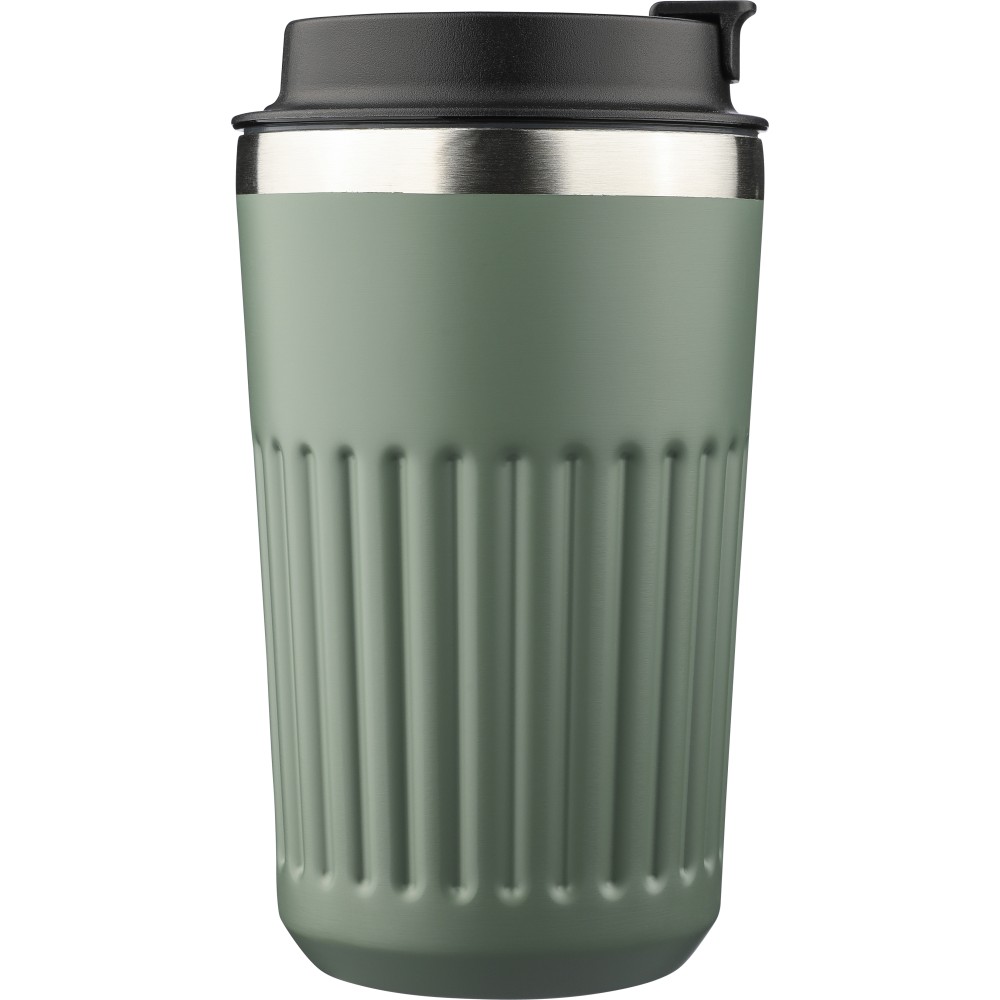 Újrahasznosított rozsdamentes acélból készült utazópohár 400 ml űrtartalommal, duplafalú kialakítással és külső bordázott felülettel. Belső része 304-es, külső része 201-es rozsdamentes acél, PP fedéllel. A pohártesten gravírozott recycled (újrahasznosított) alapanyagra utaló logó található. Darabonként barna kartondobozba csomagolva. Emblémázás: Gravírozás, Tamponnyomás