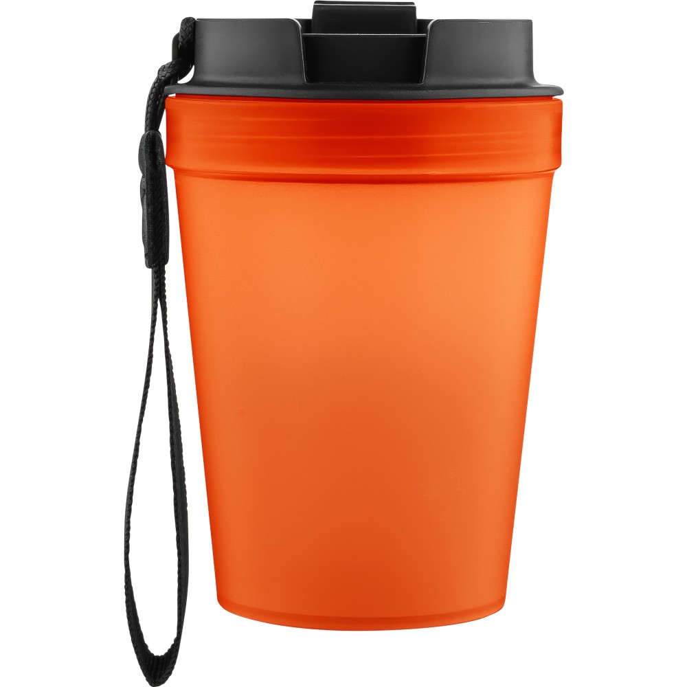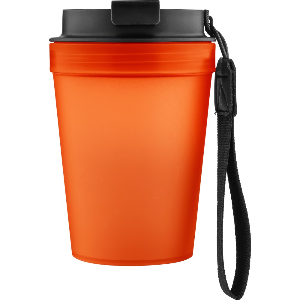 Átlátszó, szimplafalú ivópohár 350 ml-es űrtartalommal, vastagfalú kialakítással. Csavaros fedéllel és poliészter csuklópánttal rendelkezik a könnyű hordozhatóság érdekében. Tartós, ütésálló, megbízható termék. Meleg italokhoz is alkalmas, de kérjük, vegye figyelembe, hogy az egyfalú szerkezet miatt hőátadás előfordulhat.