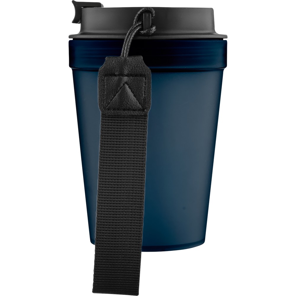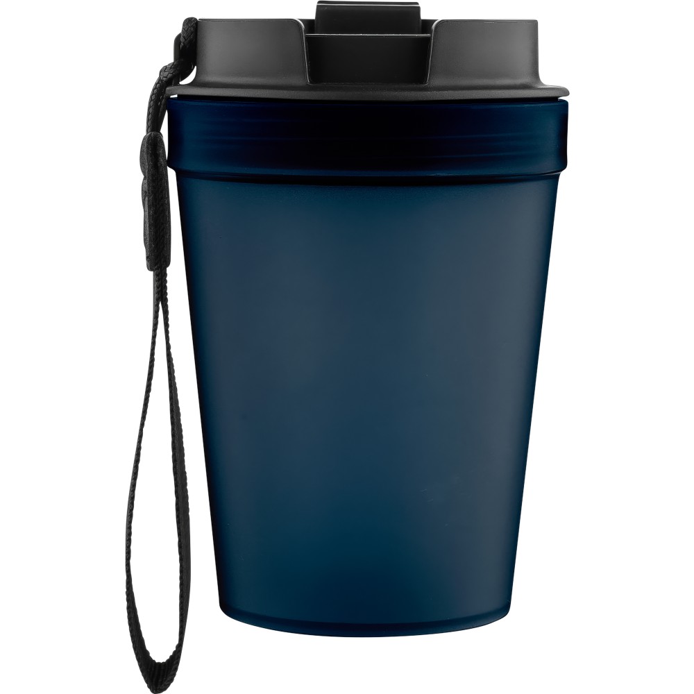 Átlátszó, szimplafalú ivópohár 350 ml-es űrtartalommal, vastagfalú kialakítással. Csavaros fedéllel és poliészter csuklópánttal rendelkezik a könnyű hordozhatóság érdekében. Tartós, ütésálló, megbízható termék. Meleg italokhoz is alkalmas, de kérjük, vegye figyelembe, hogy az egyfalú szerkezet miatt hőátadás előfordulhat.