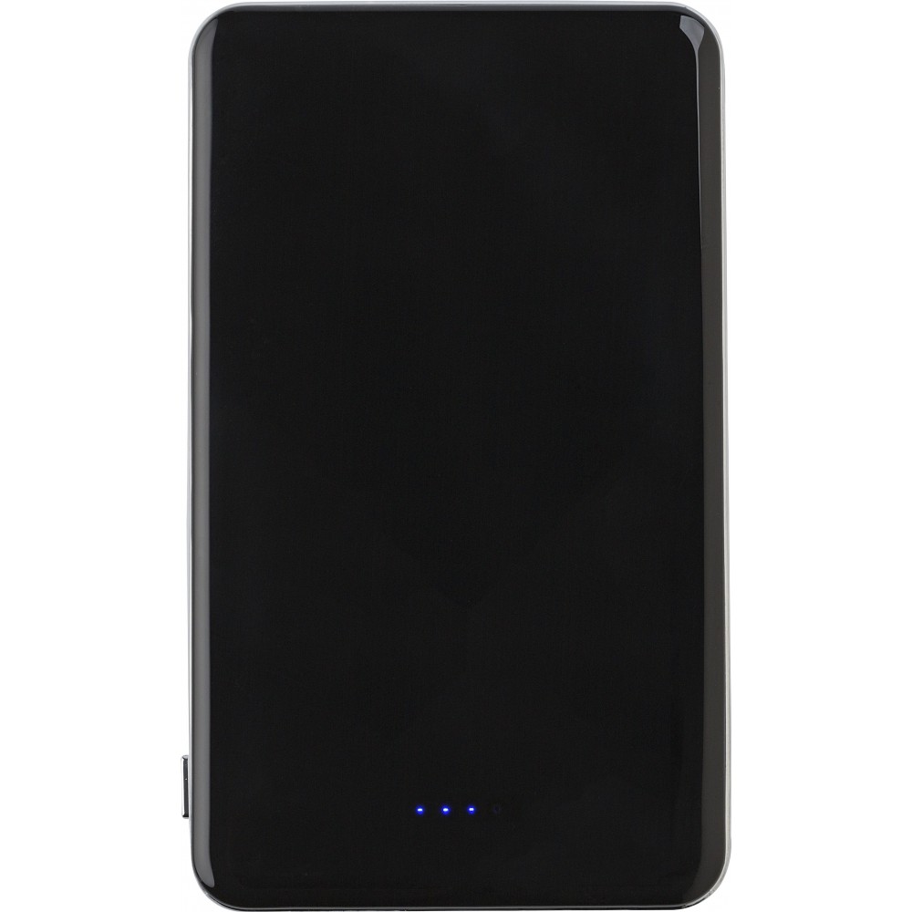Li-polimer tartalék akkumulátor 5000mAh kapacitással. Bemenet 5V/1A, kimenet 5V/1A/2.1A. Elő- és hátlapja is fényes felületű, ezüst színű oldalpanelekkel. 5 LED fény jelzi a töltöttségi szintet. A 32 cm-es USB / mikro USB csatlakozós vezetéket tartalmazza. A legtöbb elektronikai eszközzel kompatibilis. ABS műanyag. Veszélyes áru, csomagban nem küldhető. Emblémázás: Tamponnyomás