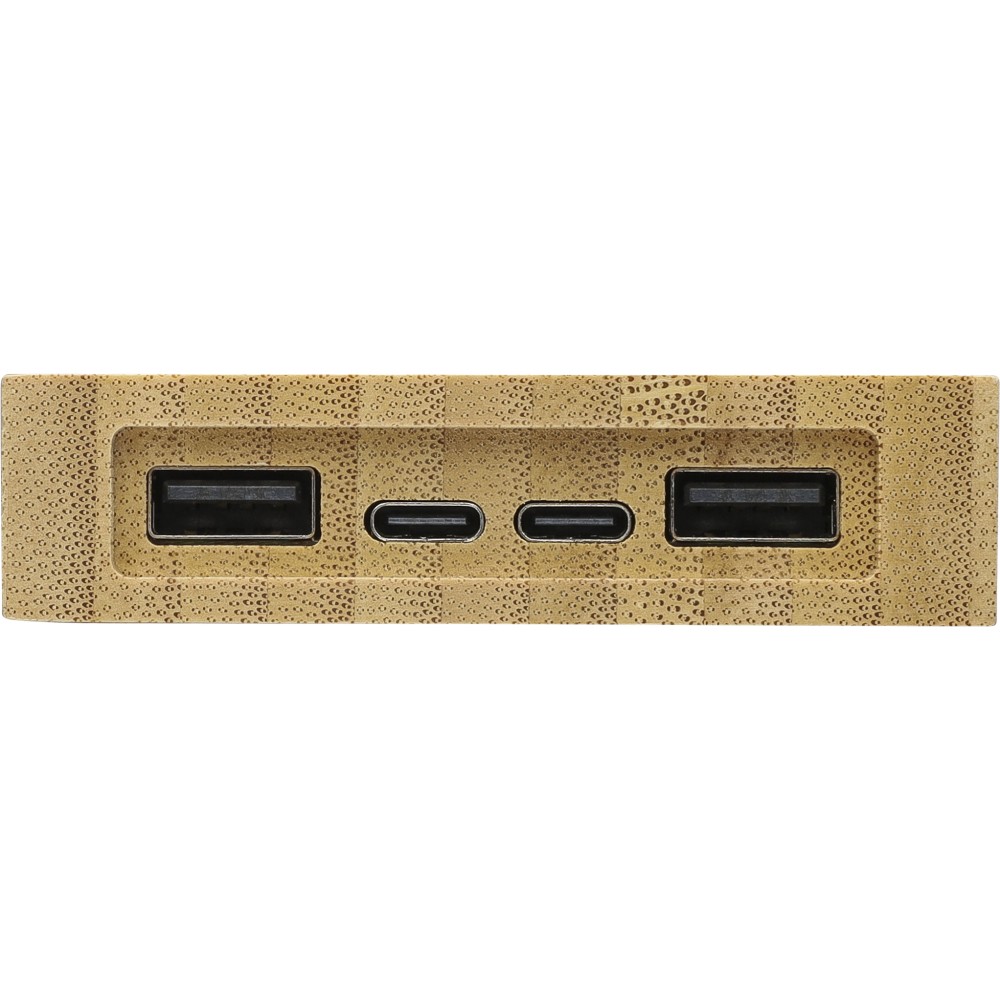 Bambusz napelemes powerbank 10.000 mAh kapacitással, dual USB-A és USB-C porttal, vezeték nélküli töltés funkcióval, beépített napelemes panellel és 5 db LED jelzőfénnyel. 30 cm-es fehér kábel tartozik hozzá. Csomagolása barna papírdoboz. Emblémázás: Gravírozás, Tamponnyomás, UV nyomtatás