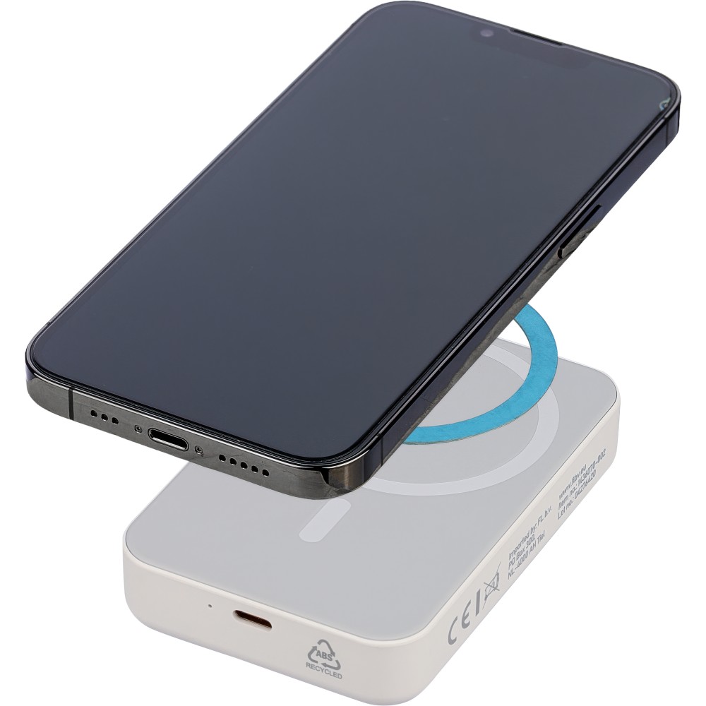 Újrahasznosított, vezeték nélküli powerbank nagy, 10 000 mAh-s kapacitással és 15 W-os vezeték nélküli töltési teljesítménnyel, MagSafe kompatibilitással. Támogatja a Type-C bemenetet és a Type-C kimenetet a hatékony töltés érdekében. A beépített biztonsági funkciók közé tartozik a túlmelegedés, rövidzárlat, túlfeszültség és túláram elleni védelem. Tartozékként egy extra fémgyűrűt és öntapadós hátlapot tartalmaz a nem MagSafe-kompatibilis eszközökkel való használathoz. Barna kartondobozba és selyempapírba csomagolva szállítjuk. Az oldalsó címke tartalmazza a termékinformációkat és az újrahasznosított ABS logót.