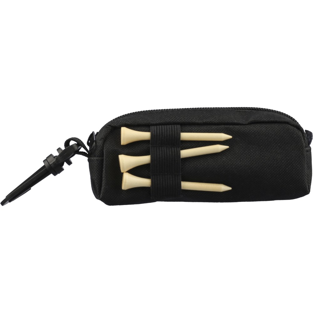 RPET anyagból készült, cipzáras tasakban elhelyezett golfkészlet PP karabinerrel, 3 gyakorló golflabdával és 3 darab bükkfából készült golftee-vel. A tasakon rPET címke található Emblémázás: Szitanyomás