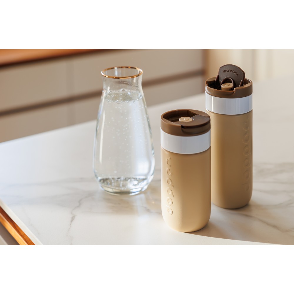 Legyen szó reggeli kávéról, napközbeni hidratálásról vagy egy esti szénsavas italról, ezt a Dopper Travel Mug-ot úgy tervezték, hogy mindenre alkalmas legyen. A meleg italokat akár 6 órán át melegen, a hideg italokat pedig 20 órán át hűvösen tartja. Duplafalú, 90%-ban újrahasznosított rozsdamentes acél testtel és tartós bevonattal készült. A könnyen nyitható, lepattintható kupak egyszerűvé és kényelmessé teszi a használatot útközben is. Mosogatógépben (emblémázás nélkül) 65 °C-ig tisztítható. Kérjük, vegye figyelembe, hogy kávé vagy tea használata esetén elszíneződés vagy szagmaradvány előfordulhat. Forró italok fogyasztásakor járjon el óvatosan!