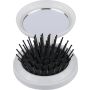 Újrahasznosított ABS-ből hajkefe és tükör, praktikus kialakítású útközbeni használatra, a terméken újrahasznosított alapanyagra utaló megjelölés található.