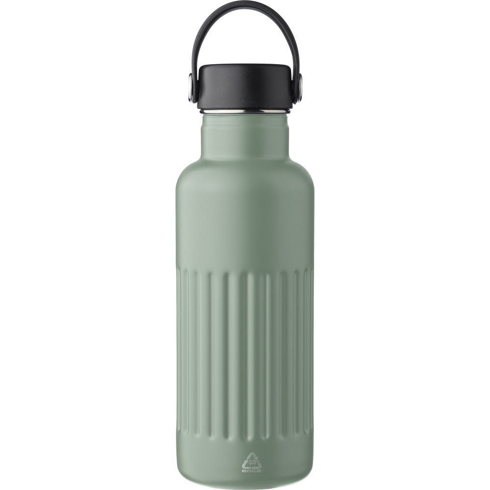 Újrahasznosított rozsdamentes acélból készült, duplafalú ivópalack 500 ml űrtartalommal. Belső része 304-es, külső része 201-es rozsdamentes acél bordázott felülettel. PP és vas kombinációjú kupakkal rendelkezik, TPE hordozópánttal a könnyű szállításhoz. A palacktesten gravírozott recycled (újrahasznosított) alapanyagra utaló logó található. Darabonként barna kartondobozba csomagolva. Emblémázás: Bögredekor, Gravírozás