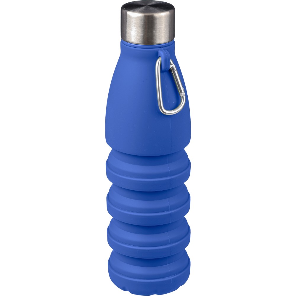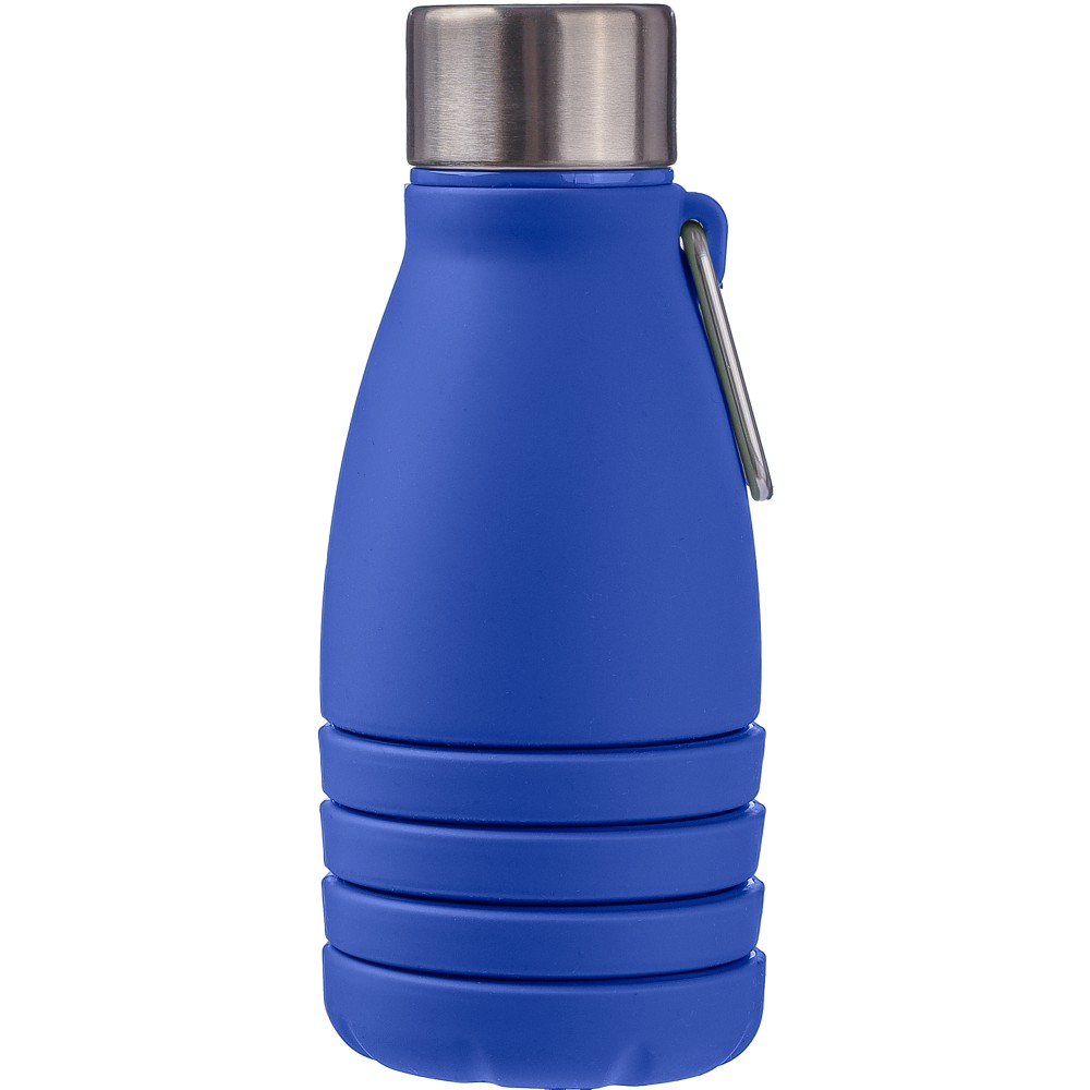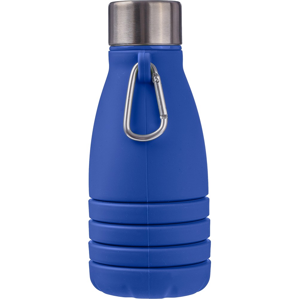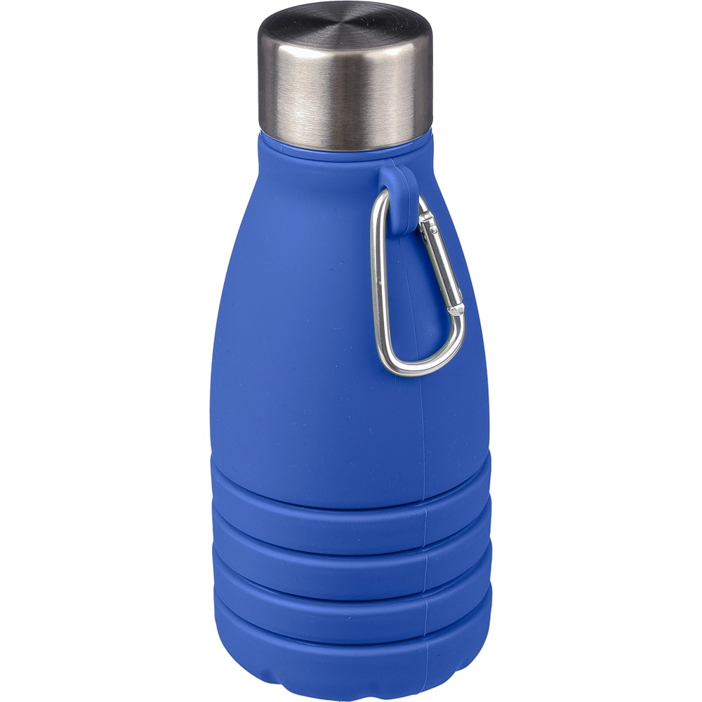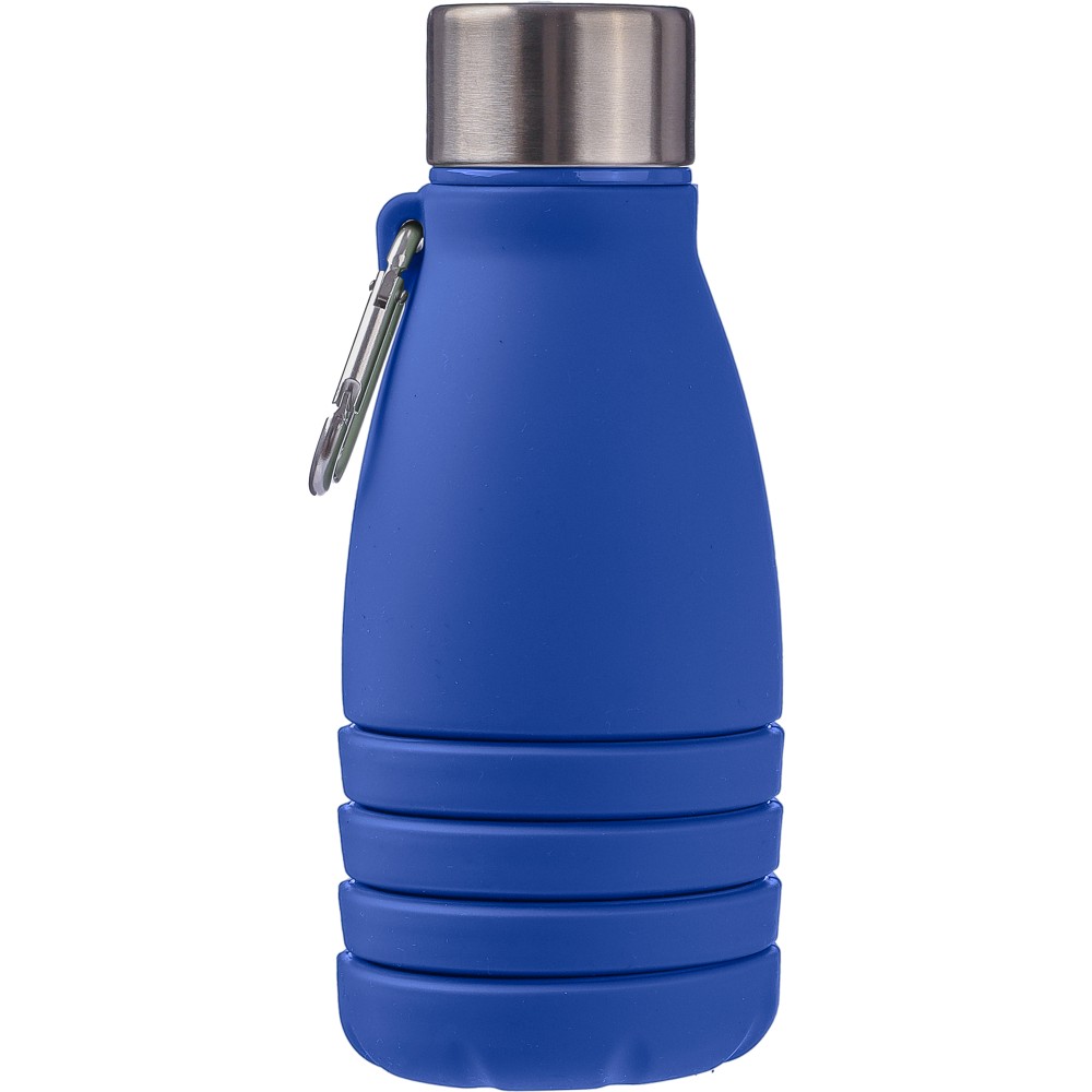 Összecsukható palack rozsdamentes acél fedéllel és alumínium karabinerrel. Összecsukott méret: d: 7x17 cm, kinyitott méret: d: 7x25 cm. Nincs egyenként csomagolva. Anyaga: szilikon. Űrtartalom: 550 ml. Emblémázás: Gravírozás